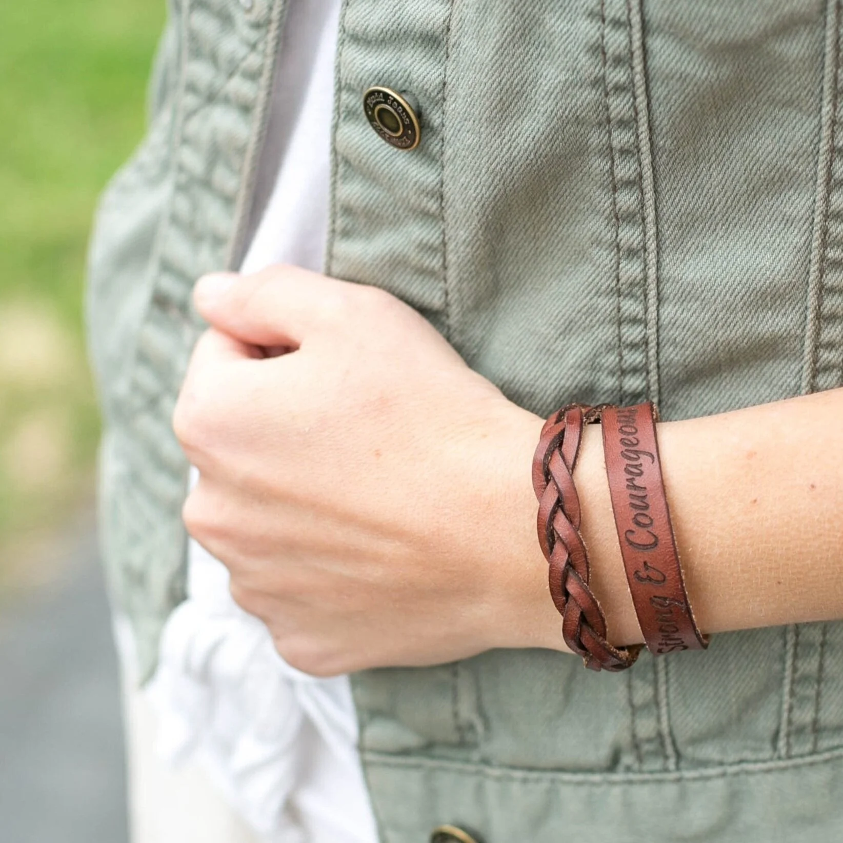 Our Genuine Vegetable Tanned Leather bracelets are laser engraved with a short saying. They would be an amazing friendship gift. The bracelet is adjustable from 5" - 10" circumference. They are .33" wide and are made out of approximately 1/8" thick leather. They are made from vegetable tanned leather which utilizes an all-natural, non toxic finishing process. They will darken and develop a gorgeous patina and softness as they age.